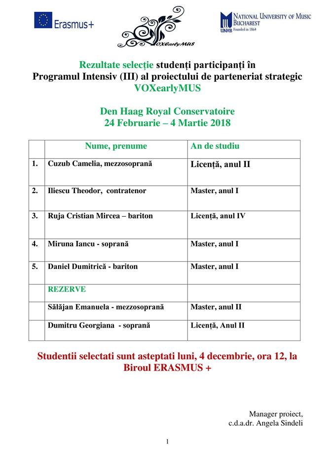 Rezultate selectie studenti pentru Programul Intensiv (III) al proiectului de parteneriat strategic VOXearlyMUS
